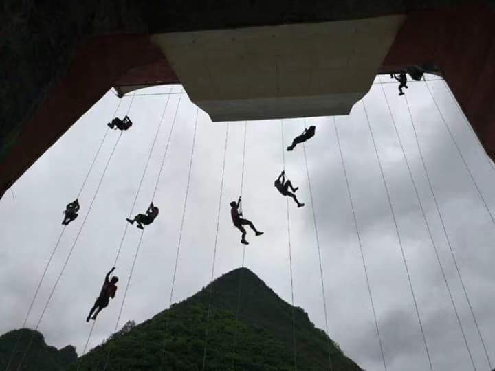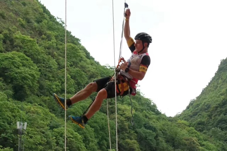 Here we have to climb 20m of vertical hanging rope with Jumars.  Our team has practised good technique and we gain over 6mins on the two other teams putting us in the lead going into the final leg, a 16km trail run.