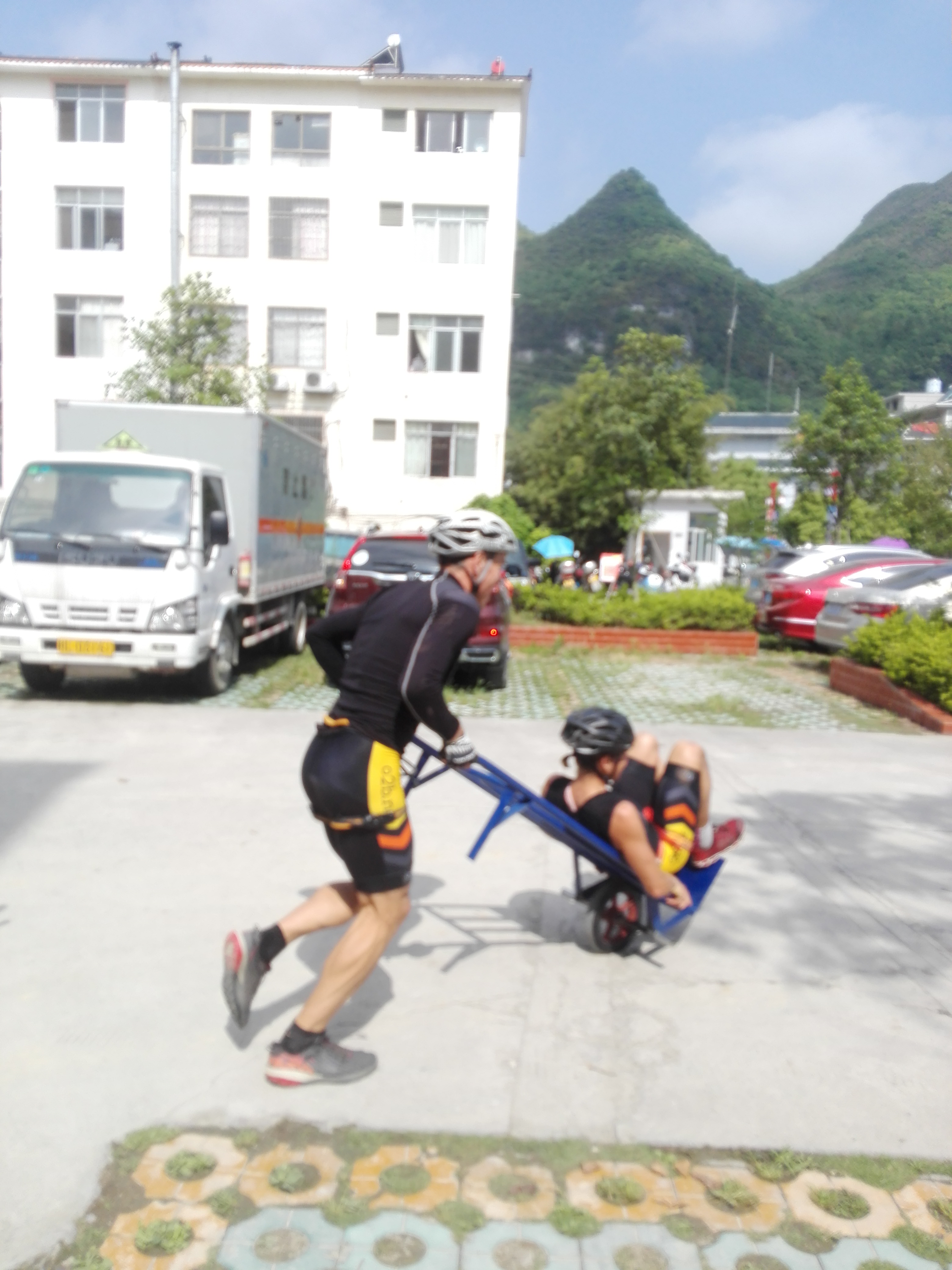 After a welcoming dinner and then Opening ceremony in the morning the day began with a fast 800m run along the roads then a 1.8km ‘wheel barrow’ where one team mate had to sit in it (Simone) while one pushed (Marcel),  Hamish and I hooked a towline onto Simone and pulled! A very aggressive and fast past to start the day had our heart rates high and us in 2nd place beginning the 28km Mountain bike.