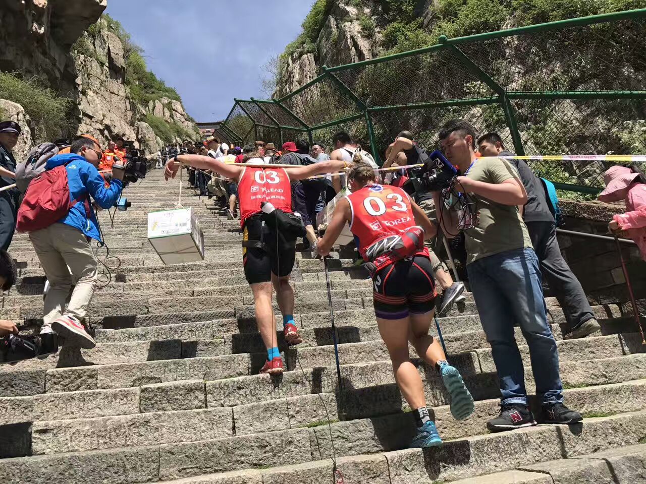 We ran conservatively for the first 2km and then it was purely stairs of various steepness all the way from 150m altitude to 1500m altitude. Tai Mountain was what we were climbing which is apparently very famous in China. This was obvious on the stairs as we had to navigate through thousands of Asian tourists also using the stairs to see the view. We yelled a lot and make a break right from the start of the stairs holding 2nd place all the way to top. Near the top, still on the stairs we had to carry a pole with two 10kg boxes on the stairs for about 400m! See photo: