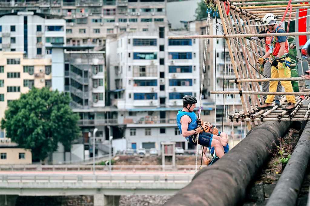 We had 18km of down river paddling to take advantage of and get away from Karst and whoever else. Working hard we created a good gap. The higher flow (in the 1000’s) meant less technical rapids but still some features that made it more fun than a lake. Finishing under a bridge in the town of Wulong we had to run up to the bridge, abseil off it then run 1km to the finish line. This time only two of us had to do the abseil. Sam Clark and myself opted for it. We misread the information about the abseil and was unaware of an untimed waiting area to allow you to put your gear on carefully. Most teams grabbed their gear then sprinted to the waiting zone.