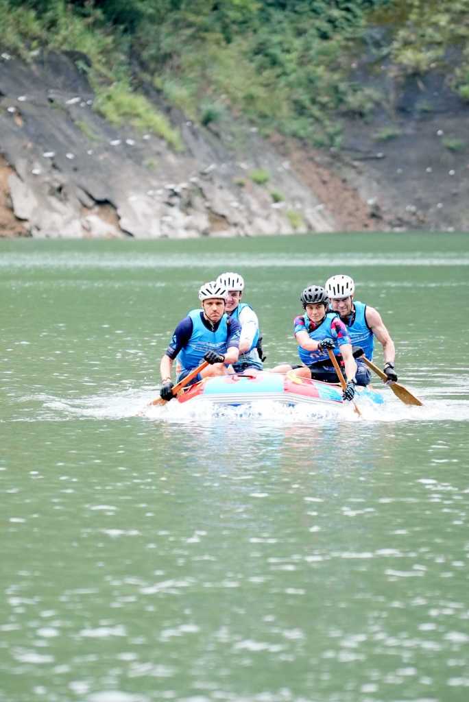 We took it cautiously again as wet concrete roads are not the best grip for our bike tires. Slightly more uphill then a 2km run downhill to the Wujiang River. We were passed by the Karst team on this descent to the river but we kept them insight and managed to get on the river in our kayaks just in front of them. In the kayaks we got to work.