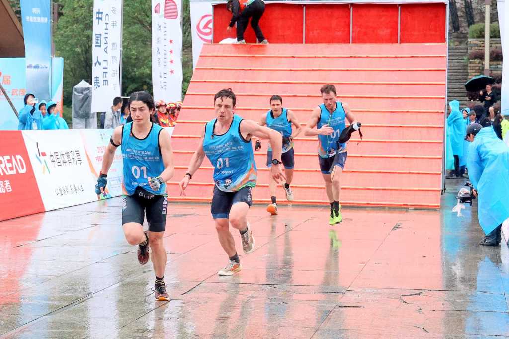 Finally some off-road riding. Trust the organisation to put us through muddy sections on the final day so we had dirty bikes to clean up after. We got into a rhythm riding well together but nothing super hard. I wanted to push hard but needed to wait for my stomach pain to settle a bit first. Around 20mins in, Flavios team came past us, moving quickly! This was enough to make me fired up to work harder! I end up on the front, desperately trying to chase them down. Eventually we reach the top and enter the final transition to the 10km running orienteering stage. We exit with our map around 1min behind Flavios team in 2nd. Straight into a very steep and muddy track that ensured we skipped out a long road section full of switchbacks, I had the map and was in control of the teams directions. At the start of today, in the overall standings we were 2nd place behind Wulong Karst the local Chinese team by around 25mins. So we had little chance to claim that back. However 3rd place, Flavios team, was only 2mins back. So in order to secure 2nd place Overall we just needed to make sure we finished with them. Easy, we had pretty much caught them back up by the first checkpoint, I came into it at slightly different angle and we were right with them. We ran stride for stride to Checkpoint 2. Then on the way to Checkpoint 3 I took a slightly different way. Even though we were with them I was still navigating the whole time as though they weren’t there, so when they went a different way I stuck to my plan. Unfortunately I missed spotting the footpath we needed due to the overgrown grass and we waded through a paddock, when we met the main road again we had lost about 200m to them. Obviously frustrating we trucked on and Alex warned me it wasn’t worth it, to just follow them to the finish line. We arrived at checkpoint 3 around 300m behind them as they had put the hammer down, running fast. Then at CP3 I made the call to run along the road to get to CP4, Flavio’s team has gone back up the hill to run through a village instead, Alex wasn’t happy about it, understandably, but I knew this one was super low risk as the road was clear but the village route was not (remember this map is just a satellite photo). At the trail entrance, where both team met up again I’m certain we gained back 200m on them and now we’re only 100m behind them. Over the next 1km, this trail would lead us to CP4 and the finish line. Easy. Turned out this trail was all boardwalk and super super slippery (it had been raining). We all had to be very careful not to fall. Sliding around, a few falls and hanging onto the handrail we made it down the staircase to the finish line just behind Flavio’s team. But it’s not over. We now have climb over a wall. The wall is 3 meters high. So pretty high! We time out while waiting for Flavio’s team to give it go. They were pretty efficient. Next our turn, We boost Deb up first, then me, then Alex boosts up Sam Clark. Last is Alex but this is the hard part. Dangling a leg down wasn’t great, and Alex pulled Sam’s shoe off, Sam then hung down head first to grab Alex’s hands while Deb and I hung onto him. Hands too slippery! Sam then throws Alex a glove and this increases grip enough for Alex to hang on and we slowly pull him up and over. That was close!