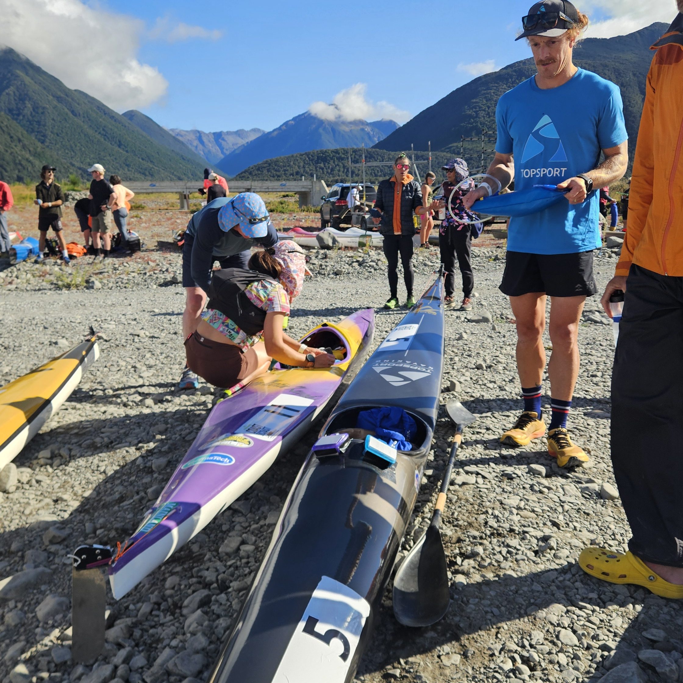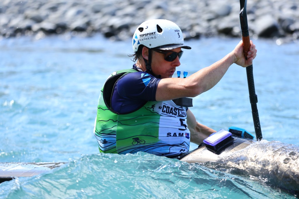 I had a small setback trying to find my bike as I got a bit disorientated. It’s new to me that they are finally racking the bikes in numbered order (smart), all my previous years it was just racked first in first served. Due to the fluster I grab my bike and run all of 30m before everyone yells at me to go back and get my helmet, duh! I’m not too worried and still buzzing off the race that I’m having. Onto the bike I settle in, but legs aren’t feeling great. I push through it hoping for a bit of blood flow and that they would wake up. Eventually I end up just taking this stage smoothly but not putting all that much power down, although I take the downhills as fast as possible. Unfortunately Hamish was obviously feeling good on this stage as he was 2mins faster! Off the bike I hobble down the gravel road with Rob my support crew, we have some chat and I apply some fresh sunscreen. I’ve avoided this in the past but it doesn’t lose me any time to apply it and makes the following days a lot less miserable, not adding sunburn to the long list of post race injuries. I also remember to tell Rob to have a look at my bike as I can’t get the front derailleur to change down from the big ring to the little ring, at which Rob reminds me ‘what the heck do you need the little ring for on the last cycle!’. I lose about 20 secs to Hamish in this run down to the kayak and apparently after that and the 15km ride I am now 16mins down, which is starting to feel like a lot! Never the less all I want is to have a good paddle and claim back some time. Lisa, my wife is there on the rivers edge ready to help me into my kayaking gear, PFD, helmet, etc. Then her and Rob hold the kayak for me to get in. Transition smooth as.