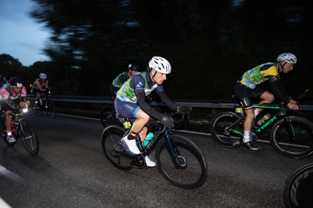 My heart rate was sitting around 130bpm before the gun went off, how good are race nerves! Off the mark I am near the front which is a nice position to be in, I heard mid pack was a game of bullrush. Still loads of people pushing through me to the front, a quick read of the bib names to identify who they are, some I know, most I’ve never heard. Credit to those who stuck around the rest of the day but so many are flogging themselves at max heart rate for no good reason. I’m feeling slightly more comfortable than previous years at this pace which is great but the final 300m always hurts the most as your body and mind becomes increasingly aware of the day ahead. I arrive into the TA in around 10th but get onto the road on my bike in around 3rd. This is obviously part due to a nice bike rack position close to the road but also a clean shoe change. Average speed for the run: 3:26min km pace (around 3:15min km on the flats).